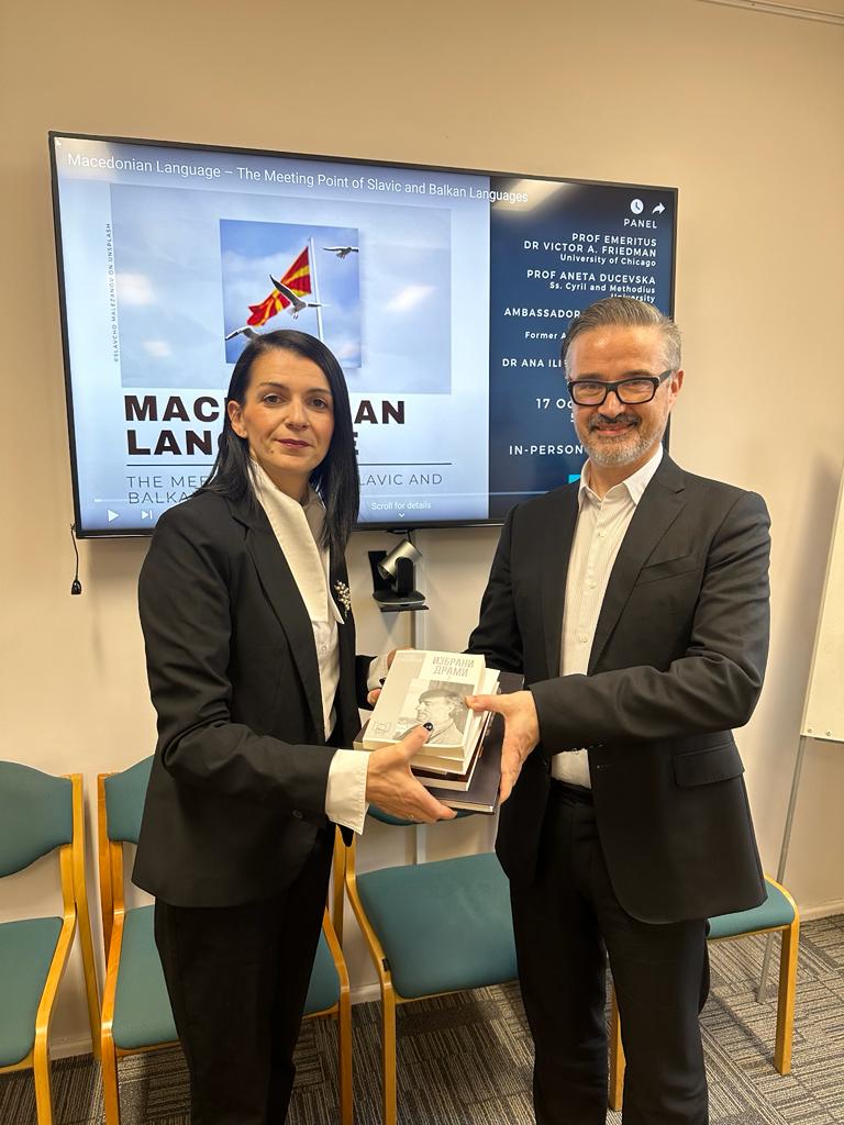 Беше разговарано за можностите за натамошна соработка во смисла на неодамнешниот настан во чест на македонскиот јазик одржан овде, во Лондон, на кој лингвисти и експерти дискутираа за местото на македонскиот јазик во семејството на словенските и балканските јазици, на кој посебен придонес дадоа говорниците Виктор Фридман и професорката Анета Дучевска.