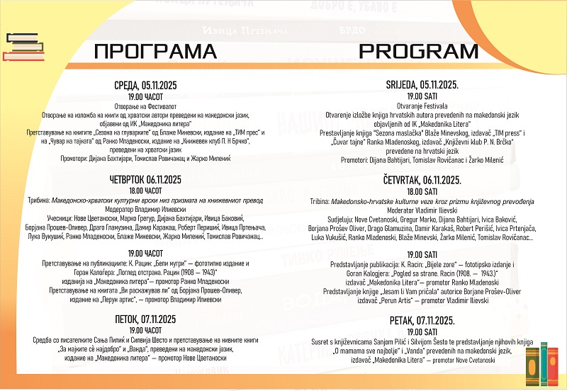 Во наредните фестивалски денови ќе бидат претставени изданијата: К. Рацин: „Бели мугри“ – фототипно издание, македонското издание на книгата на акад. Горан Калоѓера: „Поглед отстрана. Рацин (1908 – 1943)“, книгата раскази „Ви раскажував ли?“ од проф. д-р Борјана Прошев-Оливер, а ќе се одржи и трибина на тема Македонско-хрватските културни врски низ призмата на книжевниот превод. За последната вечер на Фестивалот е предвидена средба со познатите и најчитаните хрватски писателки за деца Сања Пилиќ и Силвија Шесто и претставување на нивните книги „За мајките сè најдобро“ и „Ванда“, преведени на македонски јазик и неодамна публикувани од „Македоника литера“.