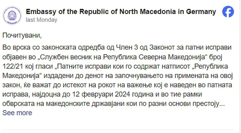 – Доколку државјаните на Република Северна Македонија кои престојуваат во странска држава и кои до 12 февруари 2024 година се уште немаат извадено нов пасош, а имаат намера да аплицираат за издавање на пасош во Република Северна Македонија, истите можат да се патуваат со “Патен лист” издаден од МК Амбасадата во Лондон. Патниот лист е важечки документ за патување во еден правец, кон Република Северна Македонија, а во земјата треба да се поднесе барање за издавање нова патна исправа (пасош), со новото уставно име „Република Северна Македонија. При издавањето на патните листови, пасошите со старото уставно име „Република Македонија„ нема да бидат поништени, стои во објавата на фејсбук од Амбасадата.