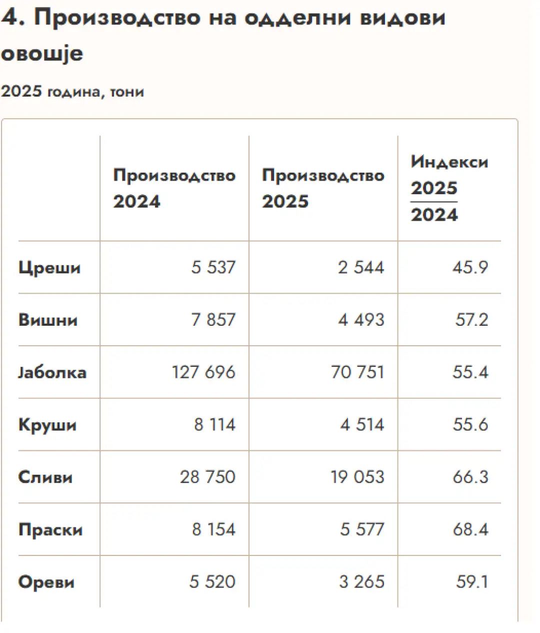 „Во 2025 година, во однос на 2024 година, е забележано значително намалување на производството кај сите овошја, и тоа од 31,6 % кај праските до 54,1 % кај црешите“, заклучиле во Државниот завод за статистика.