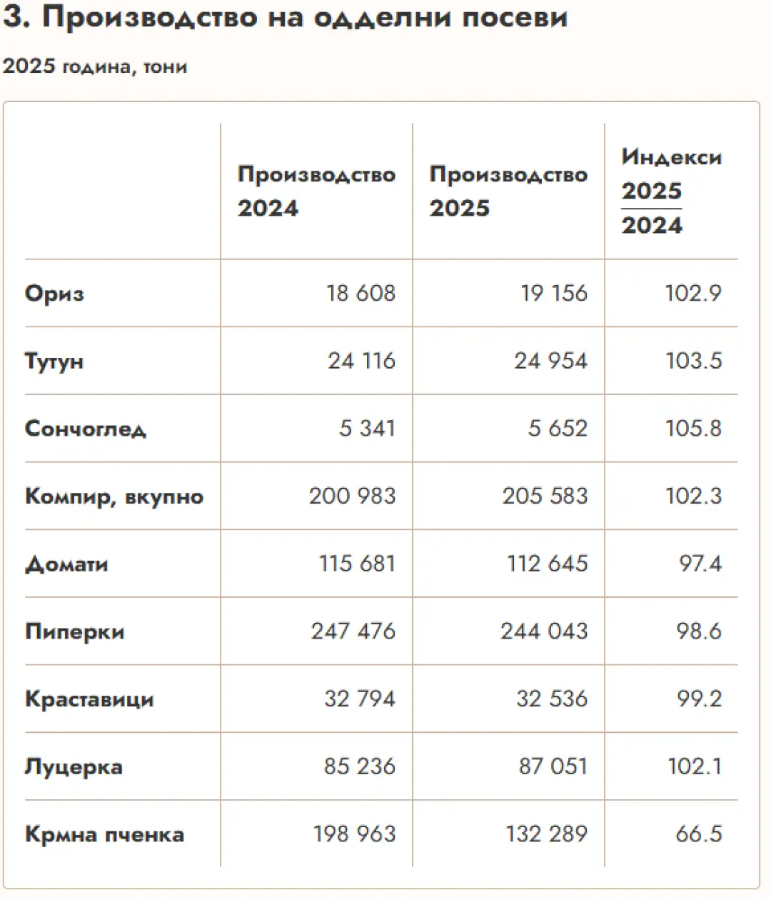 Па така, се произвеле 205,5 илјади тони компир, речиси 25 илјади тони тутун и 5,6 илјади тони сончоглед.