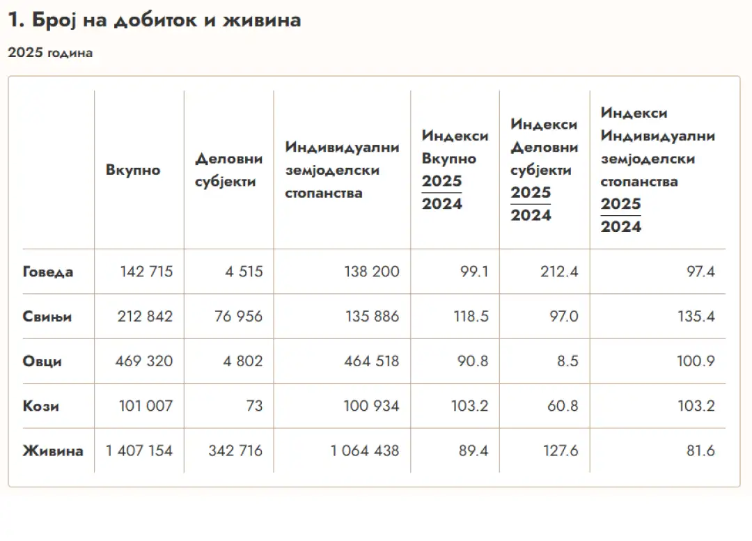 Статистичките податоци покажуваат дека во Македонија сè помалку се одгледува добиток. За една година, од 2024 до 2025, бројот на овци е намален за повеќе од 9 отсто. Во 2025 година се евидентирани безмалку 470 илјади овци, од кои многу мал дел се одгледуваат на земјоделски фарми (4 802 овци).