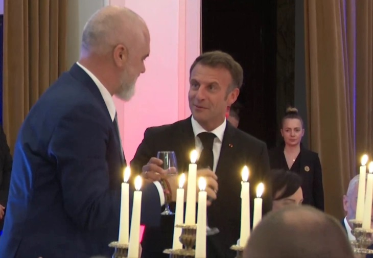 -За Албанија, албанскиот народ, за блиските и толку посебни врски што не обединуваат, за Европа. Да живее Албанија, да живее француско-албанското пријателство, рече Макрон, последната реченица на албански јазик.