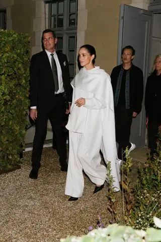 Маркл имаше одличен изглед од новата линија: долга бела панталони со копчиња, кои ги носеше преку пар соодветни широки панталони. Додавајќи драматичен шарм на изгледот, таа носеше долга наметка облечена преку рамената и зад себе. Таа го комбинираше белиот изглед со силни црни детали, носејќи правоаголна чантичка и остри потпетици со зашилен врв што ѕиркаа под нејзините долги панталони. Носеше една златна огрлица и мали дијамантски обетки. Што се однесува до косата, таа се одлучи за елегантна ниска пунџа и го заврши изгледот со сјајна, свежа шминка.