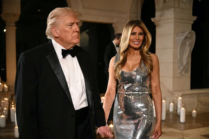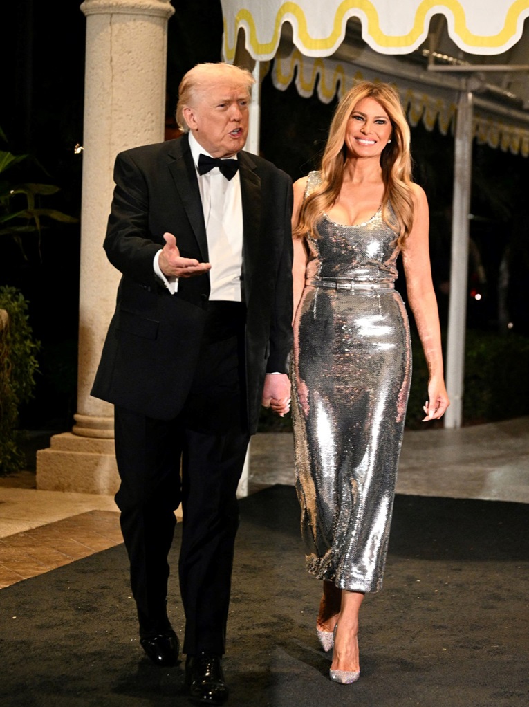 Мајами – Меланија Трамп ја дочека 2026 година во гламурозен стил, придружувајќи му се на својот сопруг Доналд на раскошна новогодишна забава во Мар-а-Лаго, според Page Six.