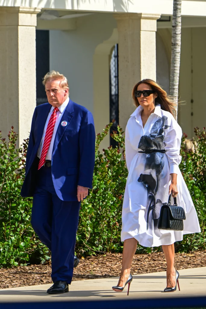 Палм Бич – Меланија Трамп се врати во центарот на вниманието во вторникот додека го придружуваше својот сопруг, републиканскиот претседателски кандидат за 2024 година, Доналд Трамп, да гласа на претседателските избори во Палм Бич, Флорида. Поранешната прва дама го направи тоа во модерни салонки и брендиран бел фустан со црн цветен принт на Александер Меквин.