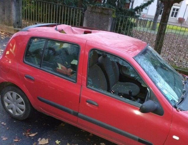 Поточно, го чекаше непријатно изненадување со пречник од половина метар, бидејќи толку беше дупката на покривот на неговиот автомобил „рено клио“.