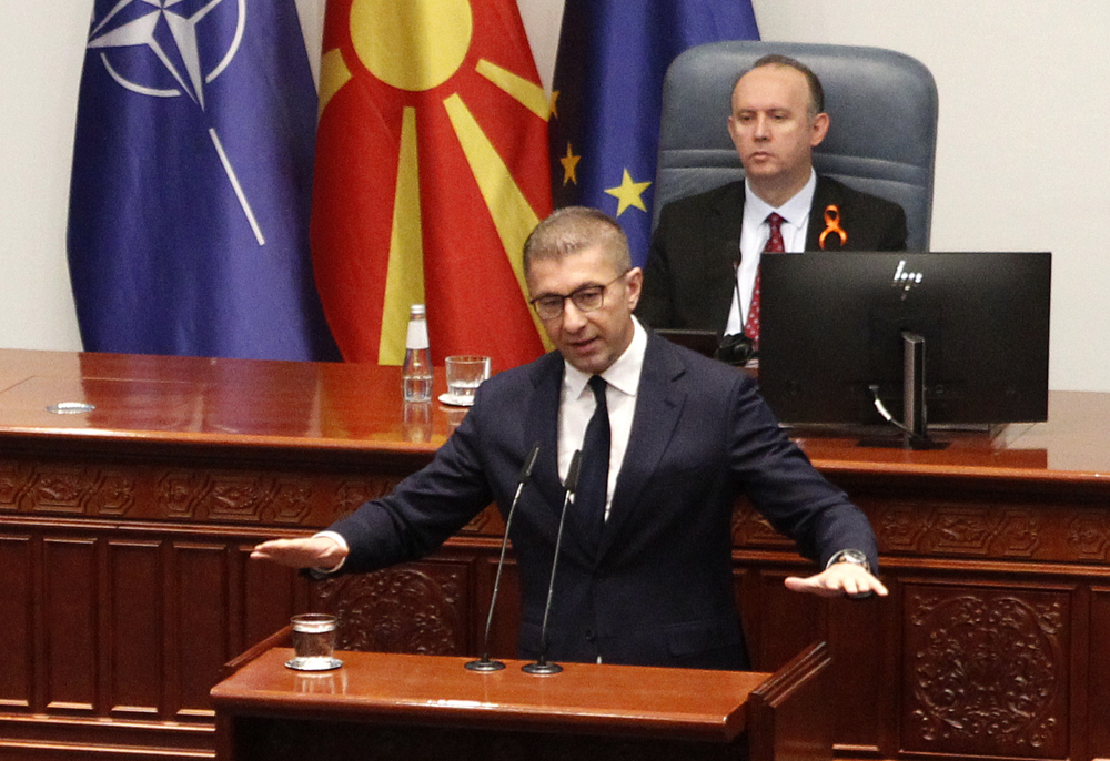 Премиерот Христијан Мицкоски денеска во Собранието го подигна за уште еден степен погоре неговиот тврд став против уставните измени и внесувањето на Бугарите во конституцијата за да продолжат преговорите со ЕУ, истовремено повторувајќи ја стандардната теза: „Додека сум јас премиер…“