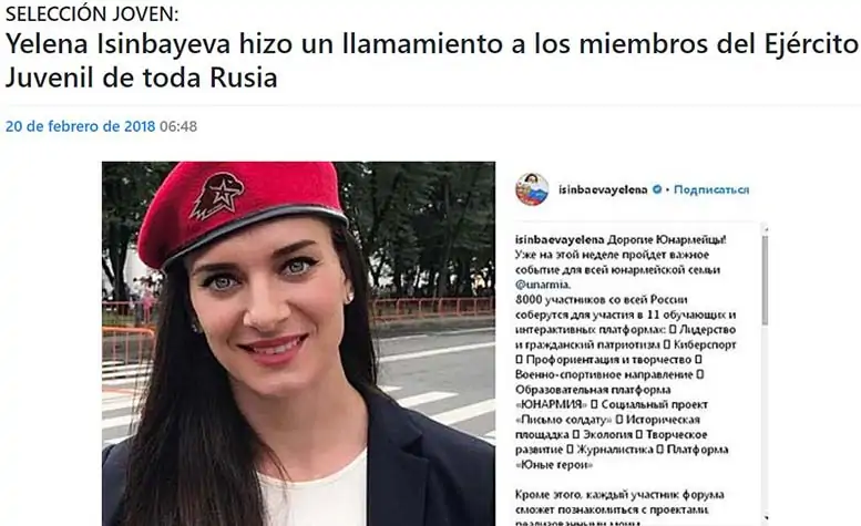 Една статија во newizv.ru објаснува како милион деца се регрутираат во Јунармија, каде што учениците се учат да ракуваат со оружје, да маршираат, да испрашуваат затвореници и да ја сакаат својата татковина. Меѓу воените водачи на движењето се хумористот Михаил Галустјан, коментаторот Дмитриј Губерниев и се разбира, спортистката-војник Елена Исинбаева. Што е Јунармија (ЈАМ)? И како се вклучила Исинбаева?
