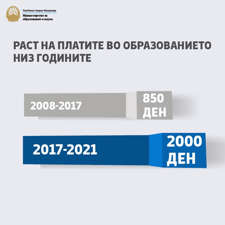 Со цел да се обезбеди трајна економска и правна сигурност на наставниците, МОН изготви законски измени со кои обезбедуваме континуиран раст на платите на наставниот кадар, согласно зголемувањето на минималната плата во државата. Ова законско решение повеќе од три месеци опозицијата го блокира во Собранието.
