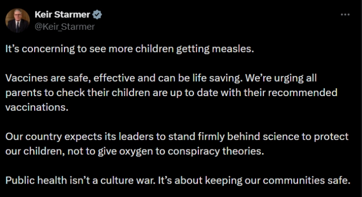 Британскиот премиер Кир Стармер предупреди дека „јавното здравство не е културолошка војна“ и ги повика родителите да проверат дали ги вакцинирале своите деца по појавата на морбили (мали сипаници) во северен Лондон, каде што заразата се шири низ училиштата.