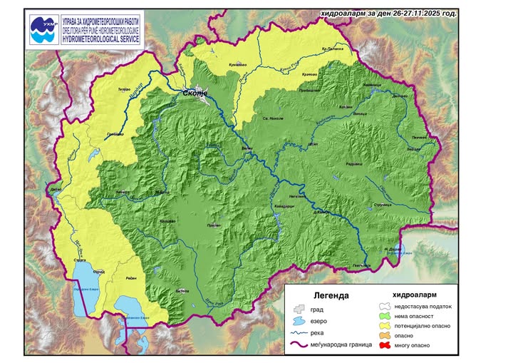 Според хидроалармот, речиси цела Македонија влегува во зона со потенцијално опасни услови, при што централниот и источниот дел се најизложени на ризик. Иако Скопје е означено како стабилно, неговата околина, Куманово, Крива Паланка, Кочани, Штип, Берово и Делчево, се во зелена предупредувачка зона, што значи дека состојбата може нагло да се влоши доколку врнежите станат обилни.