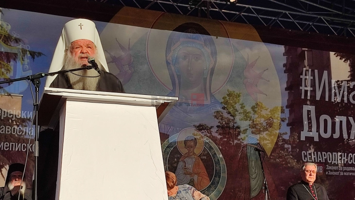 Еве не, чедата на МПЦ, собрани заедно со претставници на сите цркви и верски заедници за да им кажеме ДА на животот и на светоста на семејството оформено од еден маж и една жена, за да кажеме дека ќе ги браниме нашите најмили – децата од неприфатливи и нагрдувачки нови идеологии. Собрани сме за достоинствено и радосно да го покажеме нашето прегрнување на сиот свет како Божјо творение и да кажеме дека Црквата ниту сега, ниту кога било, не протестира против некоја личност и не отфрла никого. Нејзиното постоење е непрестаен бунт, но не против човек, туку против злото, гревот и смртта во кои, за жал, запаѓа светот. Единствена цел на Црквата е да го љуби и преобразува овој свет, но непоистоветувајќи се со него, порача архиепископот охридски и македонски г. г. Стефан во обраќањето на сенародниот собир против законите за родова еднаквост и за матична евиденција што се одржува попладнево во дворот на храмот „Св. Климент Охридски“.