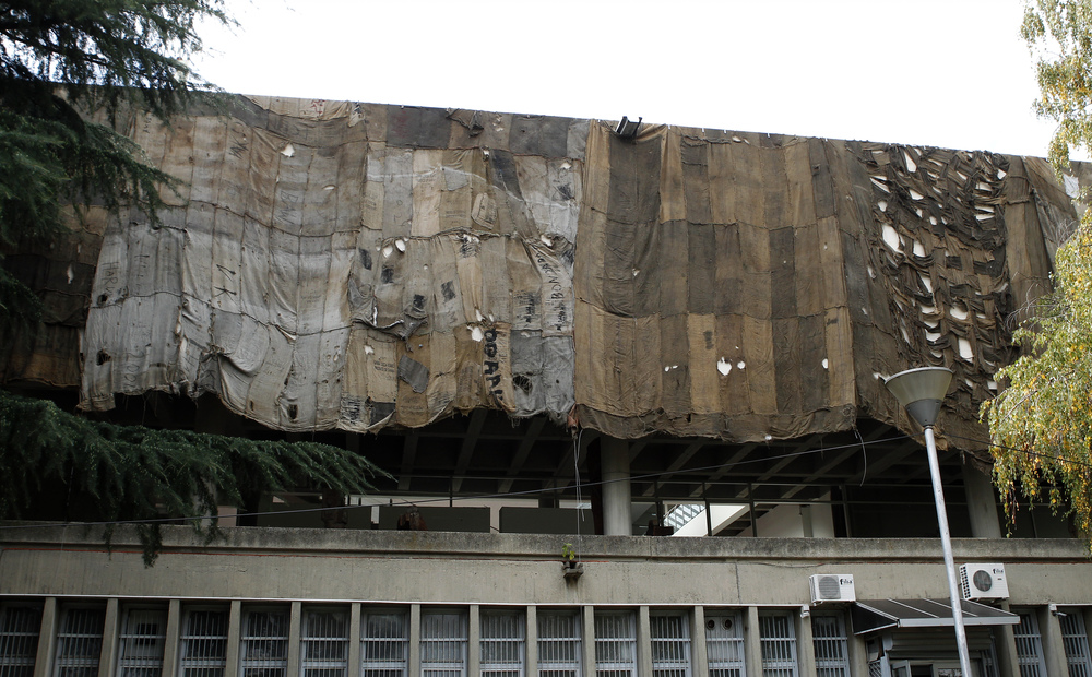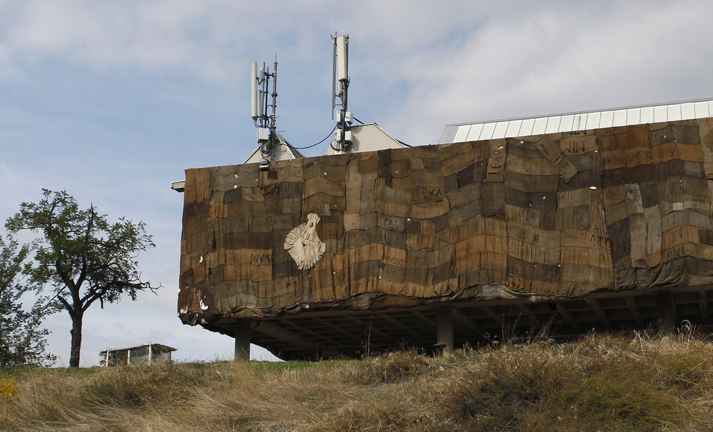 Делото истражува како историските настани се вградени во материјалноста на јутените вреќи и како преку оваа инсталација фасадата се преобразува во политичко огледало