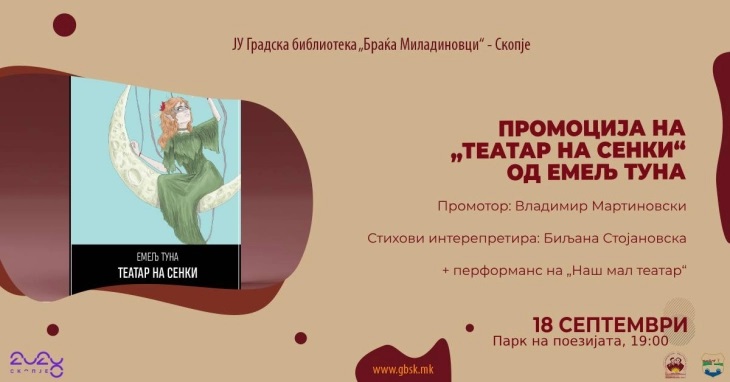 Во Градската библиотека „Браќа Миладиновци“ во Скопје, вечерва со почеток во 19 часот, ќе биде промовирана поетската книга „Театар на сенки“ од Емељ Туна. Мултимедијалната промоција е составена од перформанс на трупата „Наш мал театар“ работен според стиховите на Туна, промотивна реч на Владимир Мартиновски и интерпретација на стихови од страна на Биљана Стојановска.