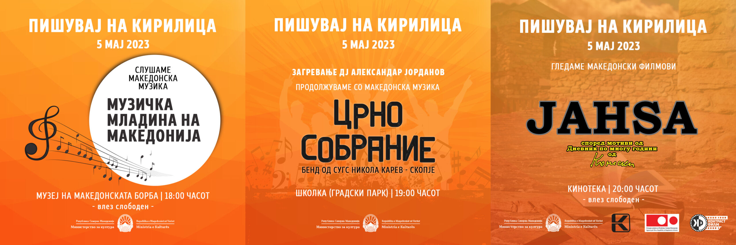 Во Кинотеката на Северна Македонија во 20:00 часот ќе биде прикажан филмот „Јанѕа“, во режија на Никола Калајџиски, кој е првиот долгометражен документарен филм посветен на животот и делото на Блаже Конески, најголемиот чувар на традицијата, историјата и македонскиот јазик. Своја проекција во рамките на овие настани, филмот „Јанѕа“ ќе има и следниот ден, на 6 мај, во Центарот за култура во Битола, од 20 часот.