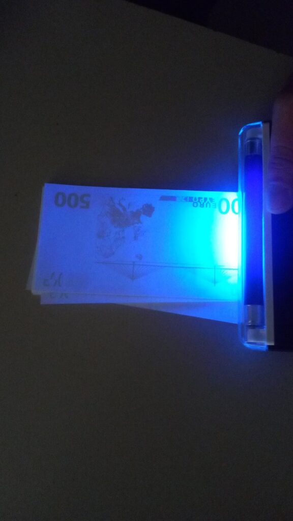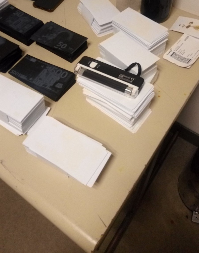 Имено, при пасошка контрола на пријавените, кои допатувале од Милано, извршена им била дополнителна гранична контрола и при преглед на багажот, кај Т.Р.Ф. биле пронајдени 2.591 исечени парчиња хартија на кои од двете страни е отпечатен дел од дизајнот на банкноти од 50 евра, 2.363 такви парчиња со отпечатен дел од дизајнот на банкноти од 100 евра, 463 парчиња со дел од дизајнот на банкноти од 200 евра, 213 со дизајн на банкноти од 500 евра, 2 исечени парчиња хартија на кои од едната страна е отпечатен во повеќе бои дел од дизајнот на банкноти од 50 евра, 78 исечени парчиња хартија без никаква ознака, како и две шишиња со течност и УВ-ламба.
