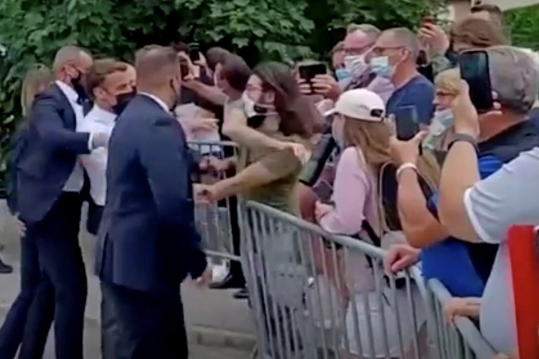 За време на посетата на департманот Дром во југоисточниот дел на земјата, Макрон се сврте кон група локални жители за да ги поздрави. Еден од нив му довикнал на претседателот и неочекувано силно го удрил со рака по лицето. Обезбедувањето веднаш го повлече Макрон на безбедно растојание и ги приведоа напаѓачот и неговиот соучесник. Тие се наоѓаат во притвор.