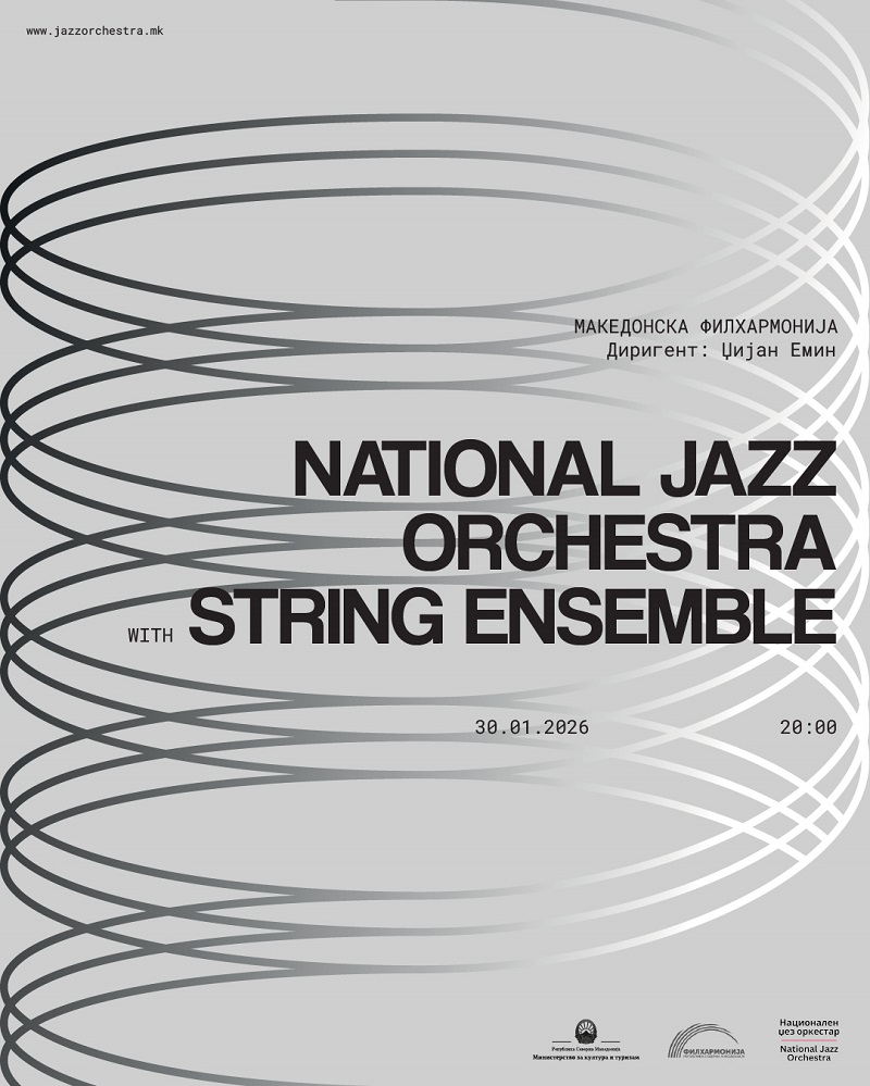 Националниот џез оркестар со настап со гудачки ансамбл составен од музичари на Националната опера и балет, в петок во 20 часот во Филхармонија ќе ја отвори новата концертна сезона 2026.