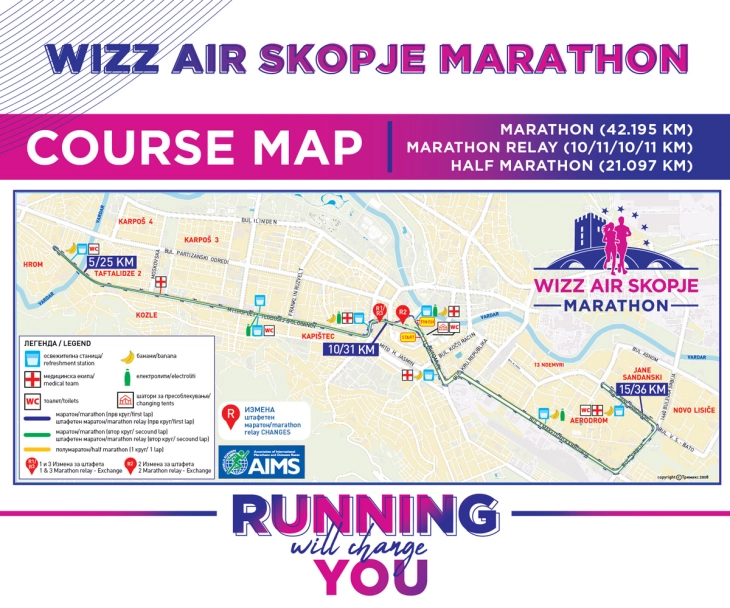Покрај маратонската трка (42,195 км), ќе се одржат и полумаратон (21,097 км), штафетен маратон (двајца по 10, двајца по 11 км) и трка на 5 км.