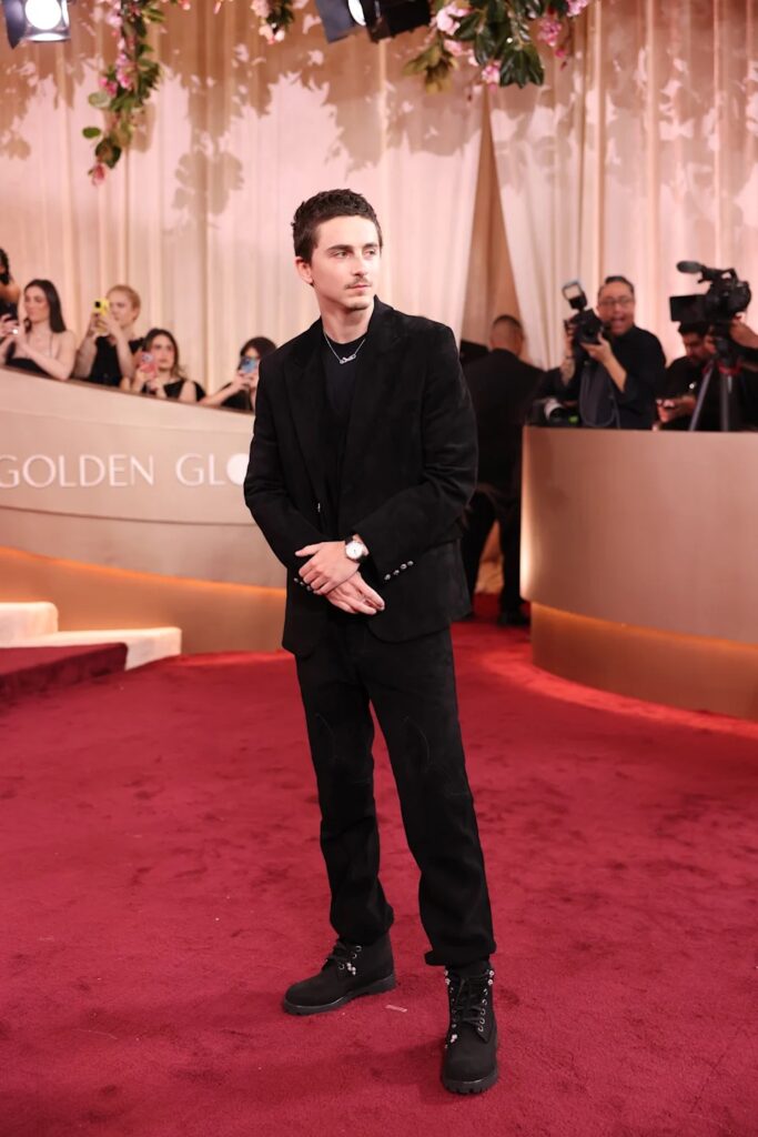 Извинете, но што се случуваше со Тимоти Шаламе и неговата мода на црвениот тепих? Како некој што неодамна го именувавме за една од најдобро облечените познати личности на Златните глобуси на сите времиња, сме крајно разочарани од облеката на актерот оваа година. Иако е јасно дека го канализира својот лик на Марти Суприм надвор од екранот, ова троделно одело е толку опуштено што сигурно нема да го паметиме со години.