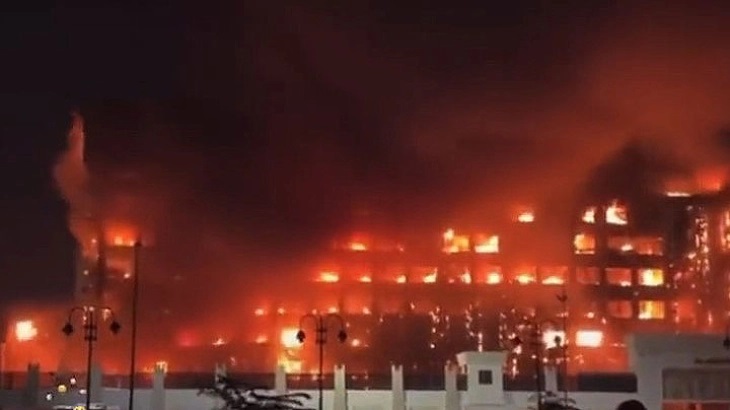 Видеата објавени на социјалните мрежи покажаа пламен како издигнува од градската управа за безбедност рано изутрринава, и се чини дека главната фасада на зградата се урна.