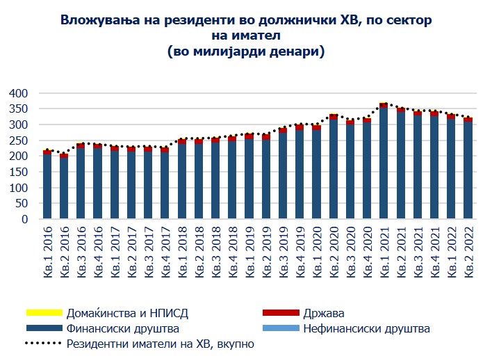 Податоците се изработуваат со квартална динамика и се однесуваат на состојбата на крајот на секој квартал, на неконсолидирана основа, искажани во домашна валута (во милиони денари). На интернет-страницата на Народната банка е објавена временска серија податоци за периодот од првиот квартал на 2016 до вториот квартал на 2022 година, како и кратки методолошки објаснувања коишто содржат подетални информации за дефиницијата, опфатот, меѓународните стандарди, секторизацијата, изворите на податоци и вреднувањето на должничките хартии од вредност.