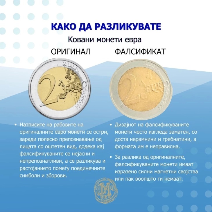 -Фалсификуваните евро монети можат лесно да се препознаат, доколку внимателно се провери дизајнот на предната и задната страна на монетата и нејзиниот раб: Дизајнот на фалсификуваните монети често изгледа заматен, со доста нерамнини и гребнатини, а формата им е неправилна. Натписите на рабовите на оригиналните евро монети се остри, заради полесно препознавање од лицата со оштетен вид, додека кај фалсификуваните се нејасни и непрепознатливи, а се разликува и растојанието помеѓу поединечните симболи и зборови, се вели во соопштението.