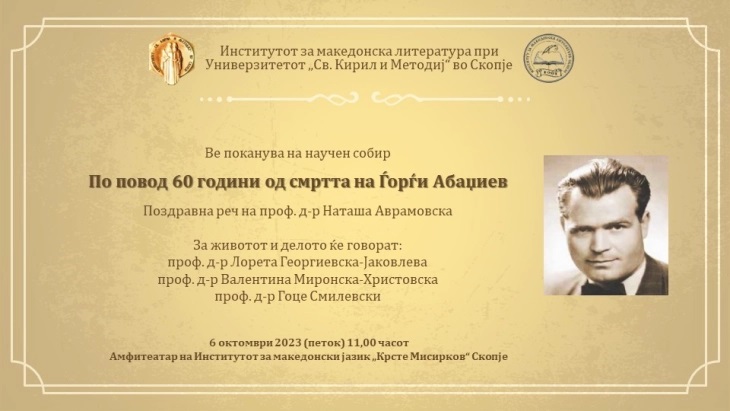 Во амфитеатарот на Институтот за македонски јазик „Крсте Мисирков” во Скопје денеска ќе се одржи научен собир по повод 60 години од смртта на писателот Ѓорѓи Абаџиев.