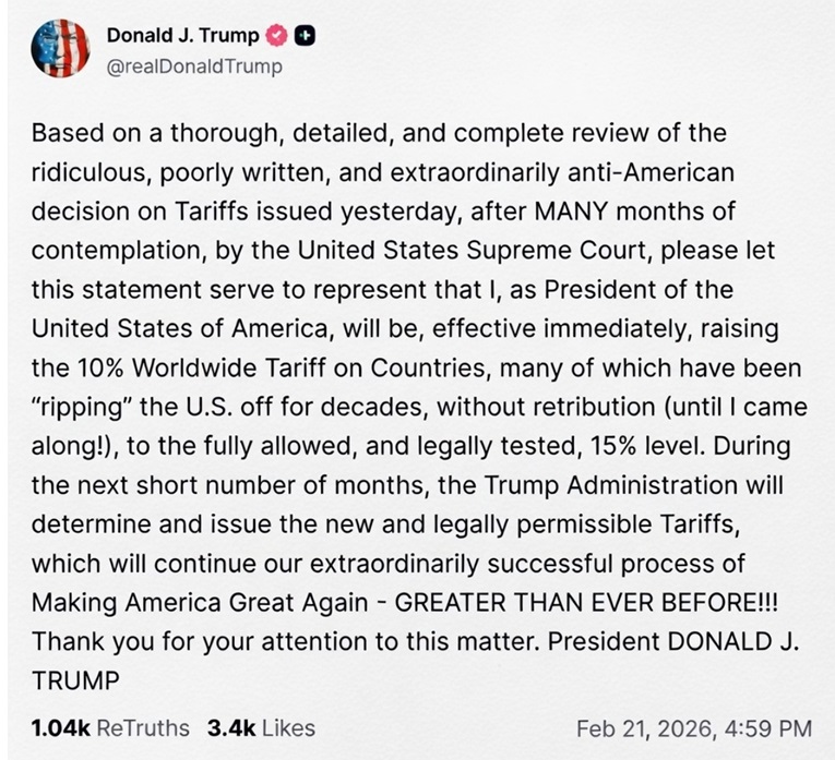 Американскиот претседател Доналд Трамп денес објави дека ќе воведе глобални тарифи од 15 отсто и продолжи да ја напаѓа одлуката на Врховниот суд со која се поништија неговите претходни увозни давачки.