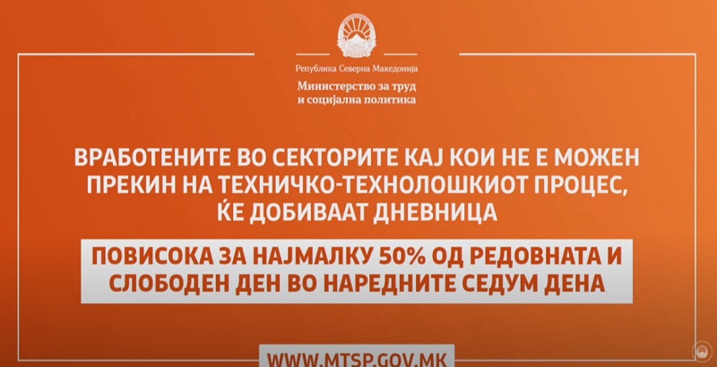 Министерката за труд и социјална политика, Јагода Шахпаска појасни дека вработените во секторите кај кои не е можен прекин на техничко-технолошкиот процес, ќе добиваат дневница, повисока за најмалку 50 отсто од редовната, како и слободен ден кој ќе треба да го искористат во наредните седум дена.