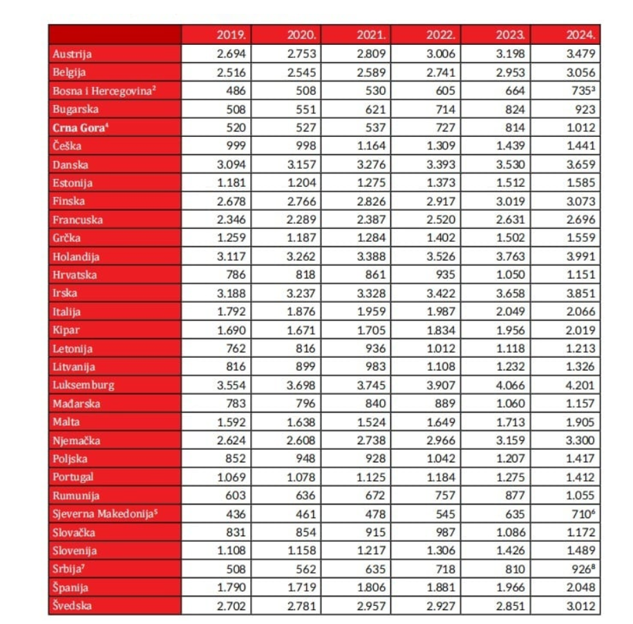 Во однос на просечната нето заработка во 2024 година, Црна Гора успеа да ја престигне Бугарија (923 евра), која е членка на Европската унија, додека сериозно се приближува до Романија (1.055 евра) и Хрватска (1.151 евра).