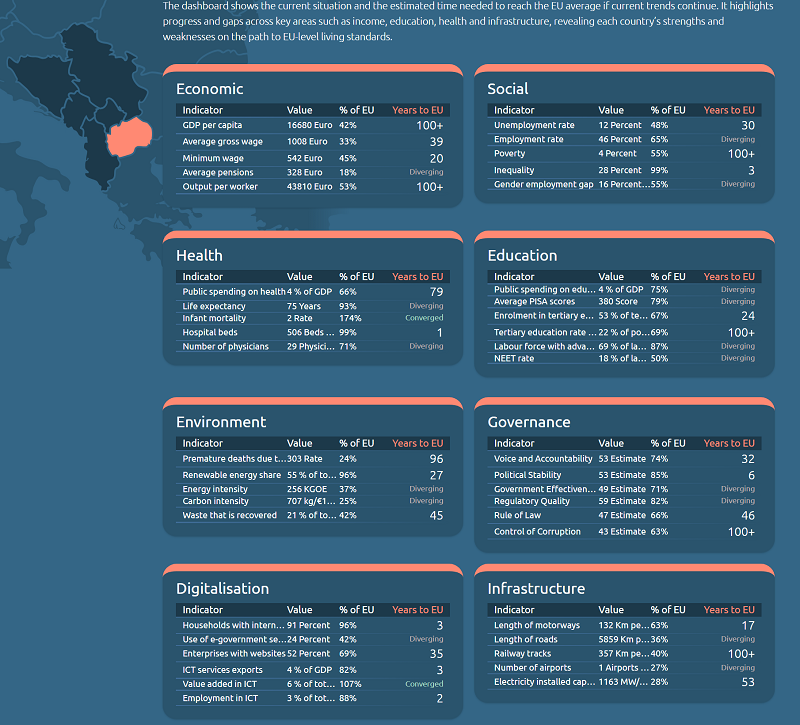 „Може да се види колку е тоа како процент од ЕУ, сите се лоши, од 20 до 40 проценти, но и колку години ќе ни требаат на сите да се стигне европскиот просек при што годините се разликуваат затоа што некои земји повеќе напредуваат некои помалку“, вели Јовановиќ посочувајќи дека ако некоја земја моментално е послаба како процент од ЕУ тоа не значи дека ќе стигне побавно, односно ако има напредок може да стигне и побрзо.