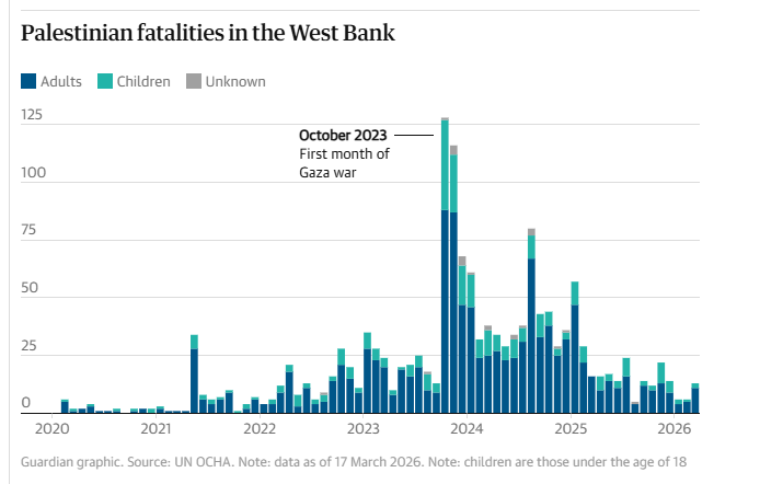 Израелските безбедносни сили се одговорни за поголемиот дел од убиените Палестинци на окупираниот Западен Брег, но насилството од страна на израелските цивили се интензивираше по нападите предводени од Хамас на 7 октомври 2023 година, додека Израел водеше војна во Газа, за која комисија на ОН, групи за човекови права и научници за геноцид велат дека е геноцид.Убиствата, палењето, кражбите и другите злосторства од страна на израелските доселеници, вклучувајќи инциденти снимени со камера и наводни сексуални напади, останаа речиси целосно неказнети.Помеѓу 2020 и 2025 година, над 96% од полициските истраги за насилството на доселениците на окупираниот Западен Брег завршија без обвинение, рече Јеш Дин. Од 368 случаи, само осум, или 2% од вкупниот број, завршија со целосни или делумни пресуди. (Јерусалем Пост, Гардијан, други извори)