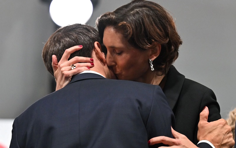 Габриел Атал, премиерот на Макрон, може да се види како гледа на друга страна додека Амели Одеа-Кастера (46) го бакна францускиот претседател.