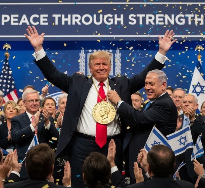 Официјалниот X профил на израелскиот премиер сподели вештачки генерирана фотографија од Бенјамин Нетанјаху како му ја доделува Нобеловата награда за мир на американскиот претседател Доналд Трамп.