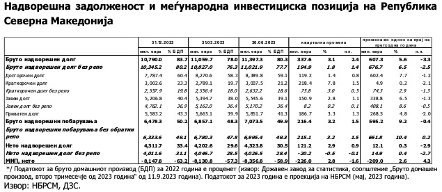 „На крајот на вториот квартал од 2023 година, бруто надворешниот долг изнесува 11.397 милиони евра и забележа квартално зголемување од 338 милиони евра. Бруто надворешните побарувања се зголемија за 216 милиони евра и изнесуваат 7.074 милиони евра. Поголемото квартално зголемување на обврските во однос на побарувањата доведе до зголемување на нето надворешниот долг за 121 милион евра, така што на крајот на јуни 2023 година тој изнесува 4.324 милиони евра“, се вели во соопштенитот на НБ.