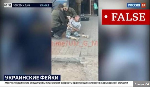 Видеото го објави државната телевизија Росија 24, со коментар дека „очигледно е обид да се прикаже куклата како мртво тело во Украина“. Репортерот „појасни“ како Украинците често користат кукли за да покажат лажни трупови, додавајќи дека таквите снимки се шират преку социјалната мрежа Телеграм, но не дадоа никакви докази.