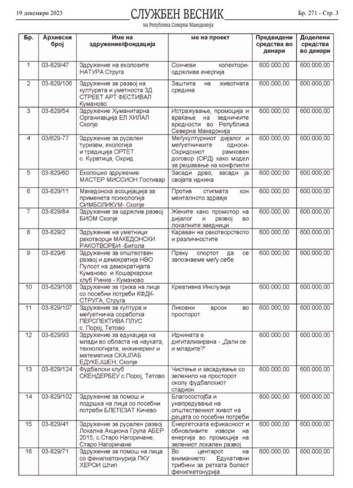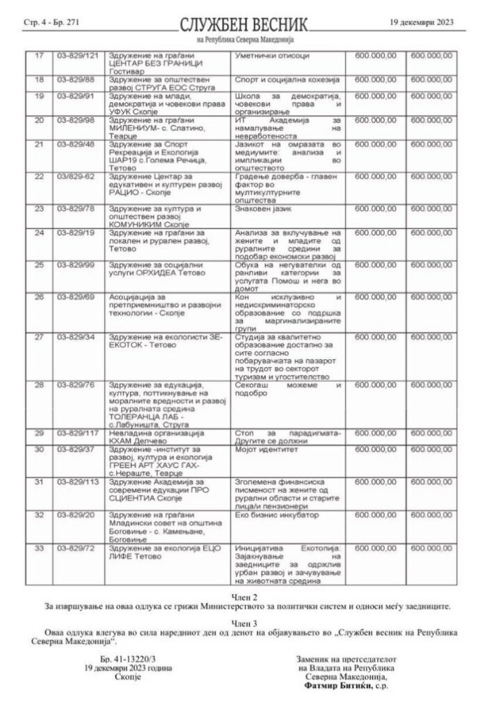Одлука за финансирање на граѓанските организации од Министерство за политички систем беше објавена на 19 декември во Службен весник, а од неа се гледа дека речиси 90 отсто од грантовите се несразмерно доделени во западниот дел од Македонија.