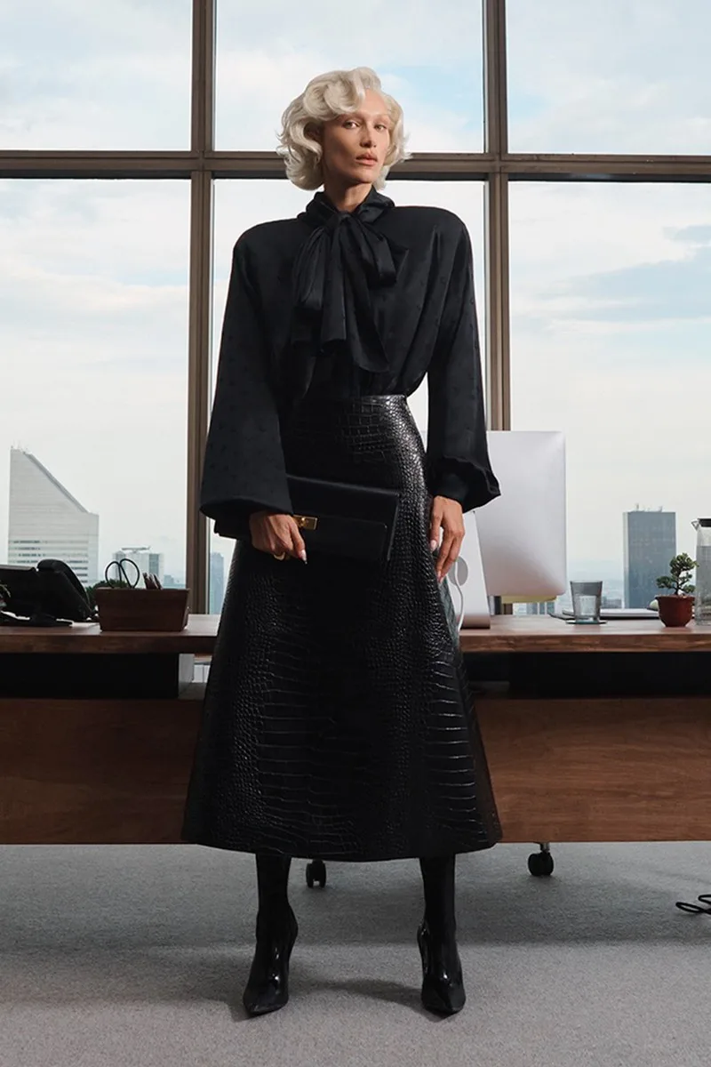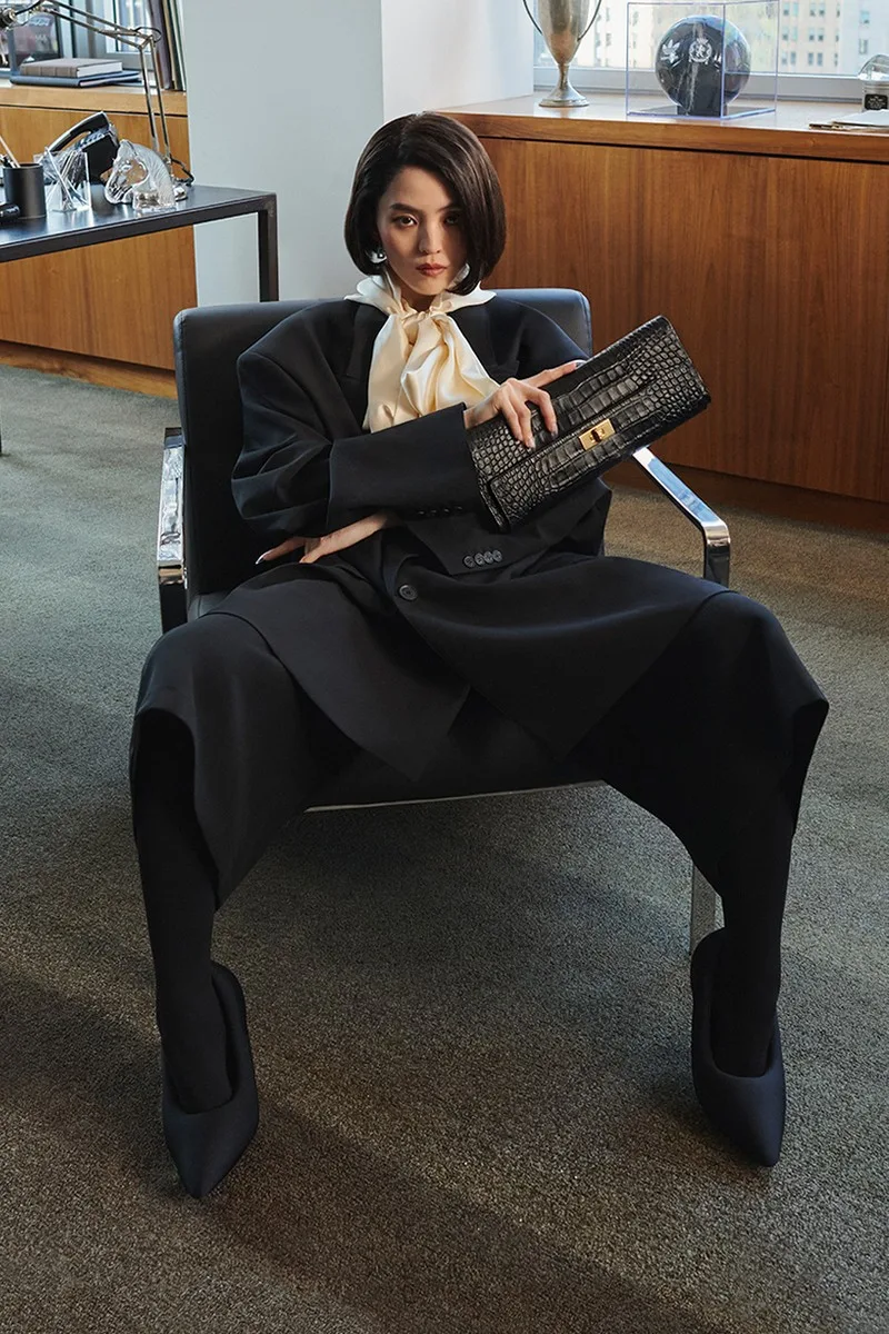 На една фотографија, Кидман е тотално во црно, со долго палто од крокодилска кожа, хулахопки и шпицести потпетици, додека соодветна чанта седи на бирото зад неа. Повторно со црвена коса, актерката позира на работ од бирото со скрстени нозе.