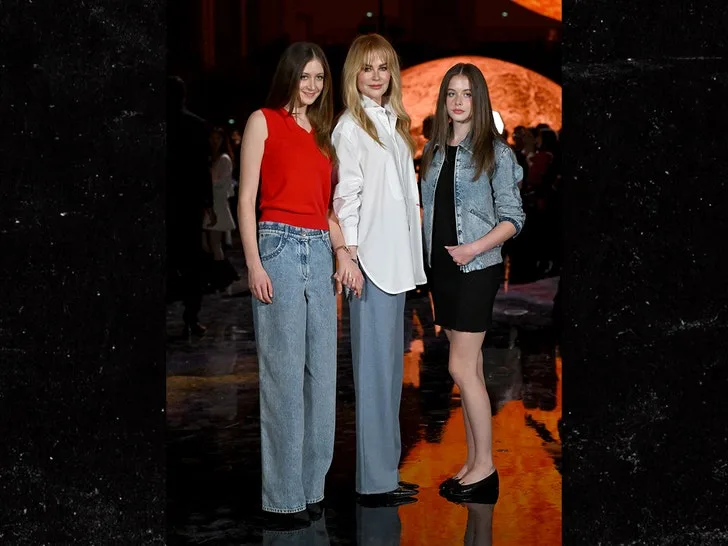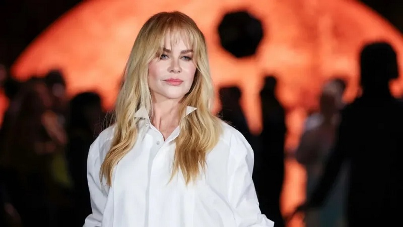 Нејзиниот изглед за ревијата – преголема бела машка кошула со широки фармерки – го дава првиот поглед на долгоочекуваната колекција.Кидман се појави без прстен среде разводот од Кит Урбан, и со шишки, заедно со двете ќерки.