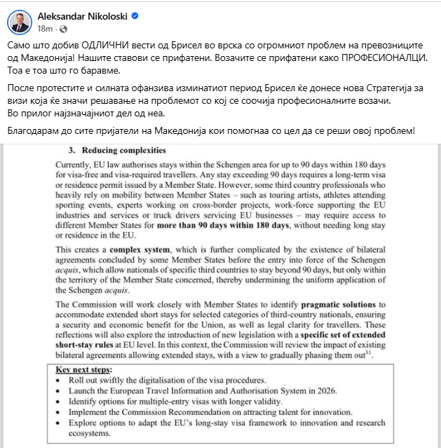 „Само што добив одлични вести од Брисел во врска со огромниот проблем на превозниците од Македонија! Нашите ставови се прифатени. Возачите се прифатени како професионалци. Тоа е тоа што го баравмe“, објави на својот фејсбук профил вицепремиерот и министер за транспорт Александар Николоски.