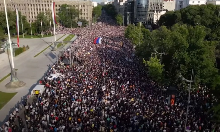 Протестите „Србија против насилството“, што се одржуваат еднаш неделно, добија замав од почетокот на мај, кога 18 лица беа убиени во два масакри – едниот во училиште во Белград, другиот во околните села. Тие убиства предизвикаа бран граѓански бунт што критичарите на лидерот на земјата, Александар Вучиќ, го нарекоа протест против „културата на насилство“ промовирана од владата и лојалните медиуми на неа, пишува весникот.