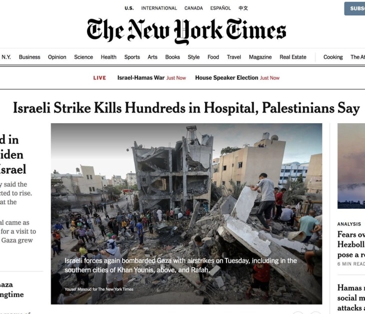 Вашингтон- Њујоршкиот весник „Њујорк Тајмс“ во ударен наслов на својата главна веб страница веднаш по експлозијата што се случи на 17 октомври објави дека Израел ја ракетирал болницата во Газа, по што се најде на удар на безброј критики по социјалните мрежи и од редица други угледни изданија.