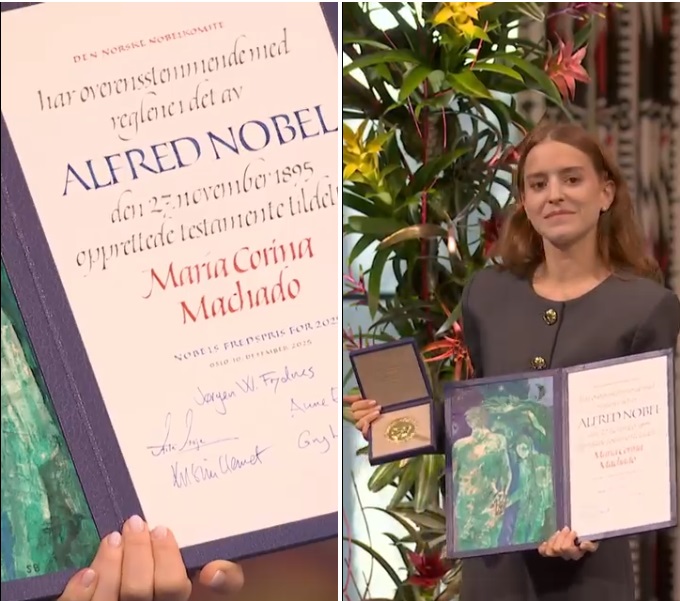 Ана Корина Соса Мачадо, ќерка на венецуелската опозициска лидерка Марија Корина Мачадо, денеска ги прими медалот и дипломата од Нобеловата награда за мир за 2025 година во име на нејзината мајка, која сè уште не пристигнала во Осло.