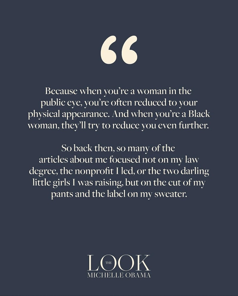Во „Изгледот“, Мишел Обама ја спушта завесата за тоа што значеше нејзината гардероба за време на нејзините осум години во Белата куќа. Таа пишува дека секоја боја, дизајнер и силуета биле дел од намерна стратегија – обид да се врати наративот кога медиумите повеќе се фокусираа на нејзините фустани без ракави отколку на нејзините политики. Сега на 61 година, Обама се опишува себеси како „пожива од кога било“, нагласувајќи дека нејзиниот стил отсекогаш бил нешто повеќе од изглед.