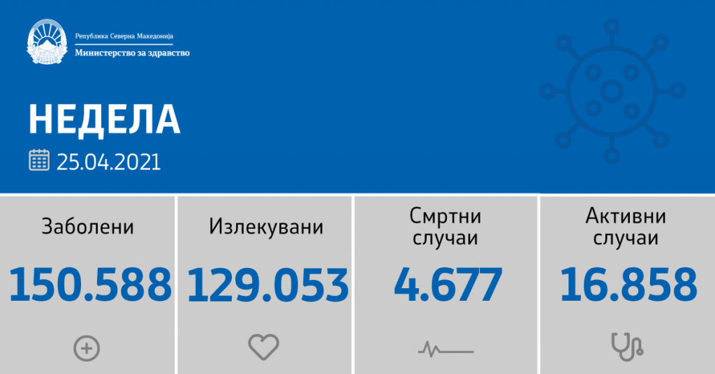 Вкупната бројка на Ковид-дијагностицирани лица во нашата земја од почетокот на епидемијата изнесува 150.588, бројката на оздравени пациенти е 129.053, на починати е 4.677, а бројот на активни случаи изнесува 16.858.