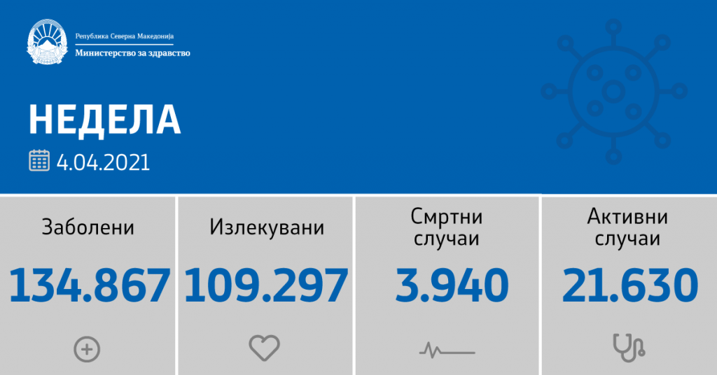 Вкупната бројка на КОВИД-дијагностицирани лица во нашата земја од почетокот на епидемијата изнесува 134.867, бројката на оздравени пациенти е 109.297, на починати е 3.940, а бројот на активни случаи изнесува 21.630.