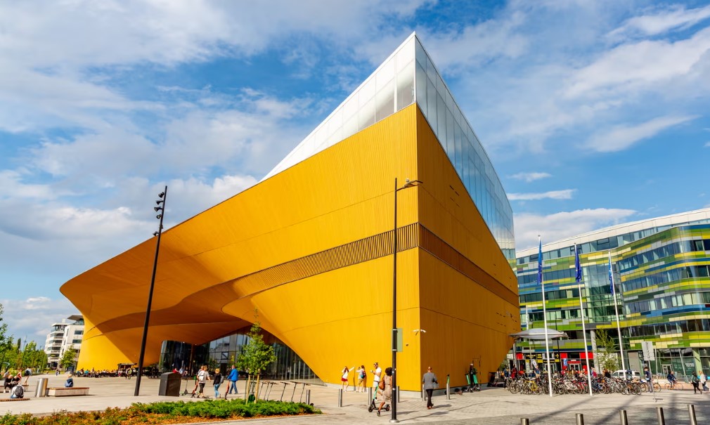 Спектакуларната зграда изградена од 160 километри финска смрека и со живи дрвја на нејзиниот последен кат, Ооди – исто така дом на студија за продукција на музика и видео, кино, работилници и „мансарда за лудило“ – има за цел да им посака добредојде на сите.