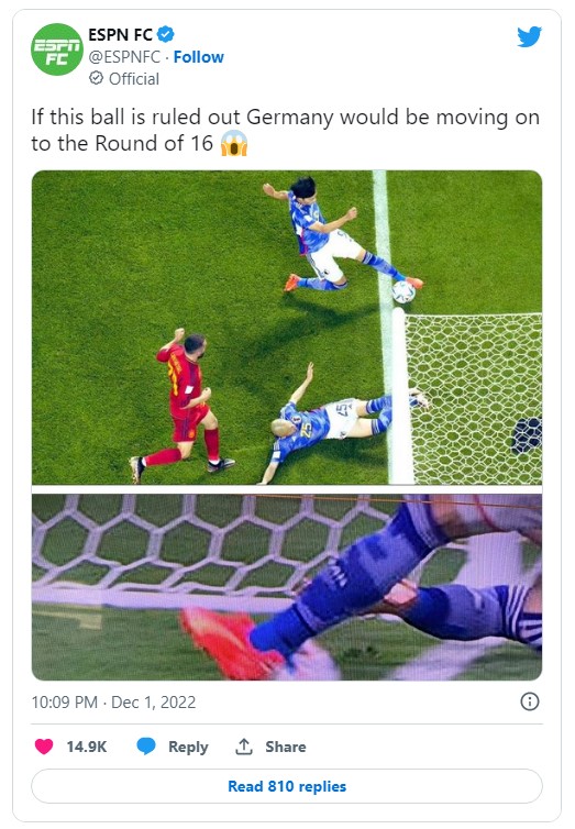 „Самураите“ за само три минути целосно го сврте резултатот. Во 48. минута резервистот Рицу Доан постигна гол, а три минути подоцна истиот играч ја започна акцијата од која Ао Танака ја затресе шпанската мрежа. Остана дилемата дали асистентот при тој гол Каору Митома успеал да ја додаде топката пред таа да излезе од теренота. Следеше проверка на ВАР, на која беше констатирано дека топката не го поминала целиот обем, а следуваше големо славје кај навивачите на Јапонија – 1:2!